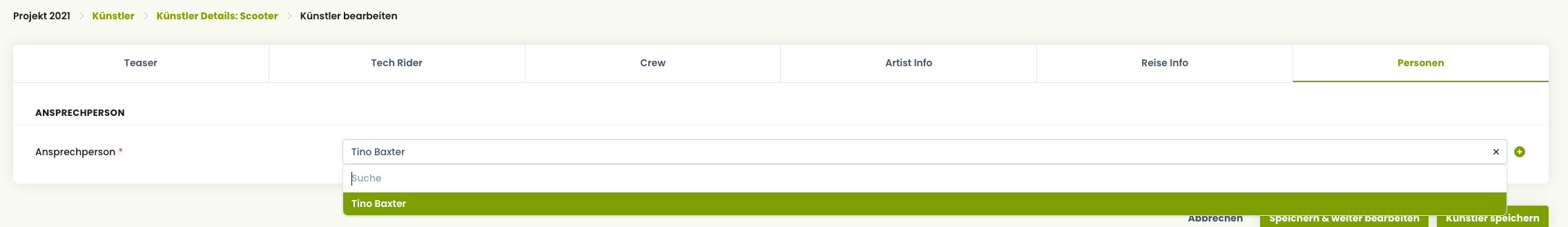 Wenn du z. B. ein DJ-Set, ein Foodtruck-Team oder ein Kollektiv auf deinem Festival organisierst, erfasst du den Beitrag als Gruppe und die beteiligten Menschen als Personen.